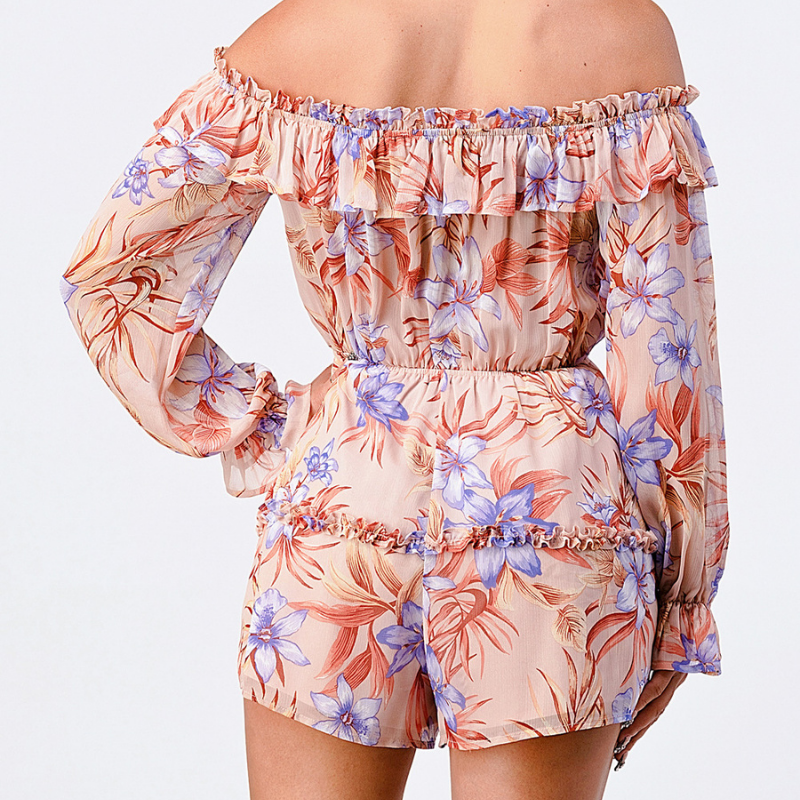 FLORAL OFF SHOULDER CHIFFON WAIST BAND RUFFLED ROMPER