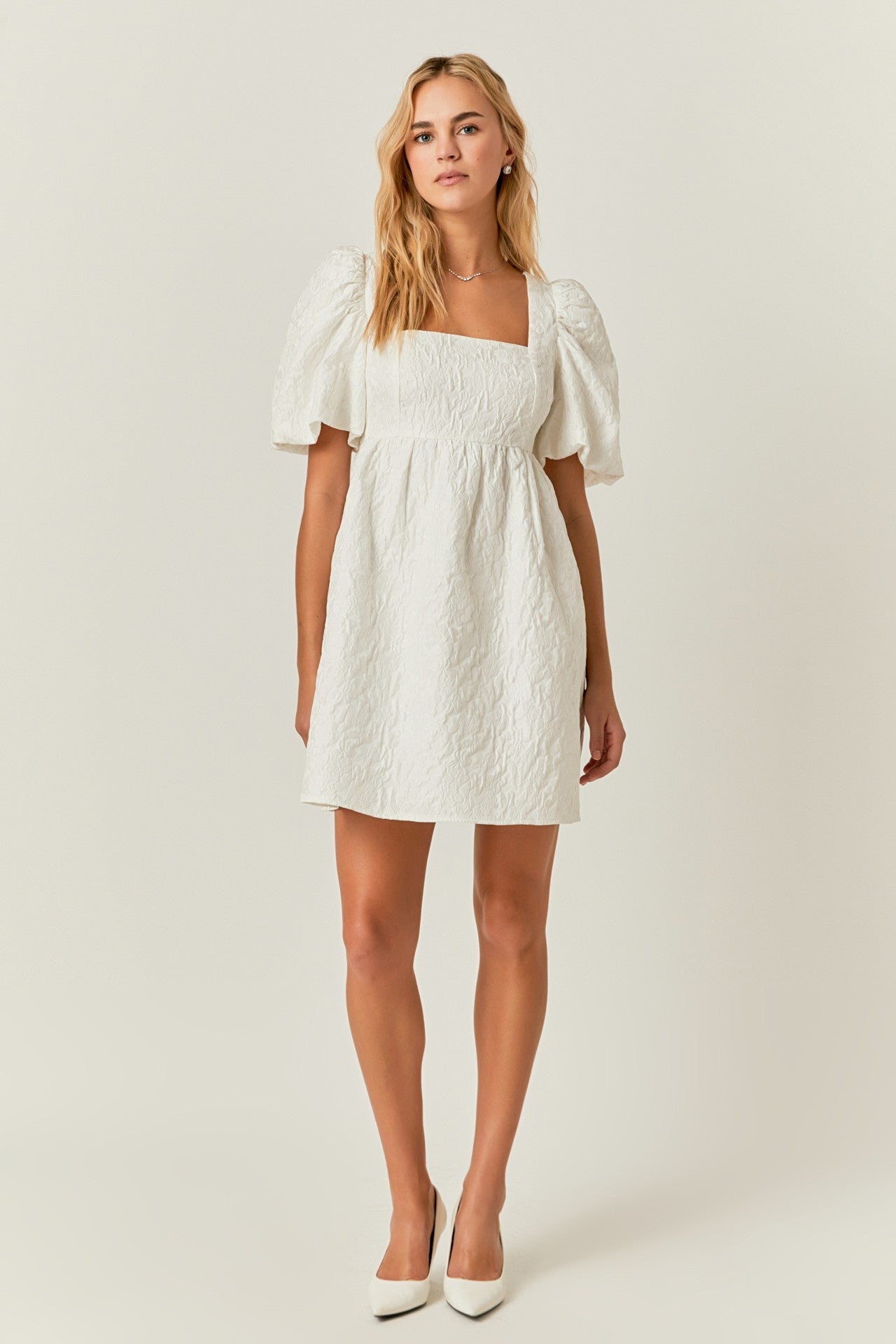 This stunning Open Back Floral Jacquard Puff Dress boasts a delicate floral jacquard pattern, chic puff sleeves, and a square neckline. Its cut-out open back and spaghetti tie add a touch of allure, while its mini length is perfect for any occasion. Elevate your style with this must-have dress!